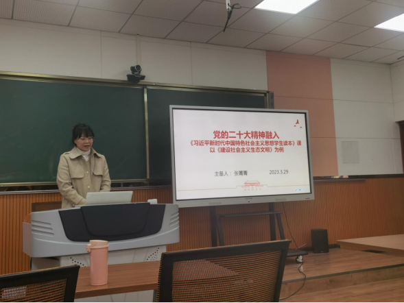 此次培训中,德育教研室教师路春燕、张菁菁分别进行了专题为《党的二十大精神融入<建设社会主义生态文明>》、《习近平新时代中国特色社会主义思想学生读本(大学)》的说课和集体备课展示,为青年教师的教育教学研究夯实了教研基础,开阔了专业眼界,拓宽了教学思路。