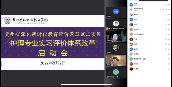 会上,侯芳宣读了《贵州省教育厅关于贵州省深化新时代教育评价改革试点立项的通知》,与会人员对该试点项目的风险进行了讨论与评估,对《关于贵州省深化新时代教育评价改革试点项目“护理专业实习评价体系改革”实施方案(讨论稿)》提出了修改意见与建议。