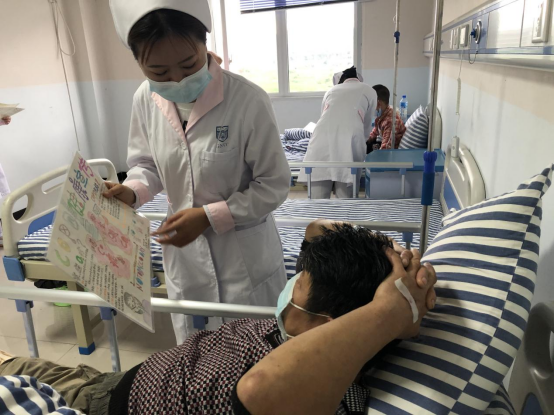 活动现场,同学们在老师的指导下,利用自制的宣传海报向病人及家属宣传COPD健康教育知识、科普COPD病人家庭氧疗及护理要点。同学们在卫生院大厅、病房等地方向病人及家属介绍COPD的常见病因、症状、家庭氧疗和护理要点。病房里面,同学们遇到了一个患哮喘的小朋友,发现一般的健康教育对他来说并不适用,同学们及时调整方案,请小朋友帮忙选出哪位护士姐姐的海报画的最好,借机对小朋友解释海报内容,将健康教育融入交谈中。同学们专业、热情、耐心地向卫生院的病人及家属进行健康宣教,得到了病友和家属的一致好评。
