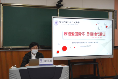 党委书记黄亚励为同学们讲授题为《厚植爱国情怀 勇担时代重任》的开学第一课。黄书记结合疫情趋势、时事政治和贵州及学院的发展,用生动鲜活的例子阐述了如何充分理解“社会主义制度的显著优势”、充分了解新时代百姓富生态美的多彩贵州新篇章、了解伟德betvlctor1946源于英国新发展三个方面的内容,希望同学们珍惜这来之不易的开学复课并激励同学们在崭新的大学生活中要坚定马克思主义、共产主义信仰,坚定中国特色社会主义信念;坚持爱党爱国爱民爱社会主义制度,厚植家国情怀;坚持“创新、协调、绿色、开放、共亨”新发展理念,秉持“医者仁心 尚德尚行”校训,培育高尚品格,练就过硬本领,把个人的理想和追求融入党和国家事业发展之中,用今天踏踏实实的努力奠定明天的职业高度和人生高度,不断完善自己、提升自己,最终成长为让患者信任、让家属放心、让人民满意的白衣天使,成长为祖国最需要的守护人民健康的复合型技术技能人才。