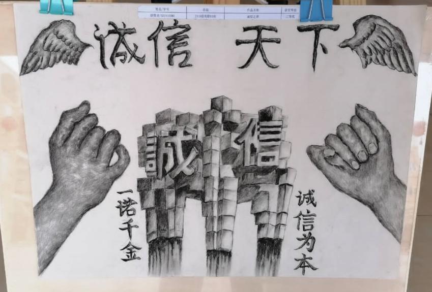 此次活动,参赛作品共104幅,同学们通过艺术作品展现了自己对“诚信” 主题的理解和认识,给人视觉冲击的同时,也增强了艺术的表现力。