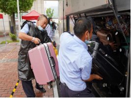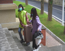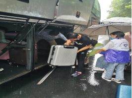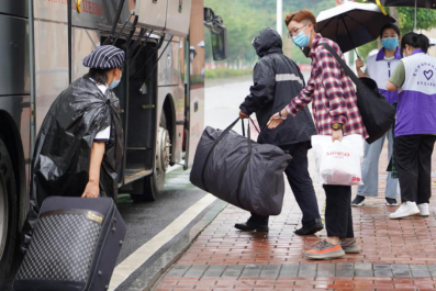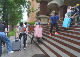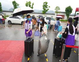 学院教职工志愿者冒雨为学生搬运行李
