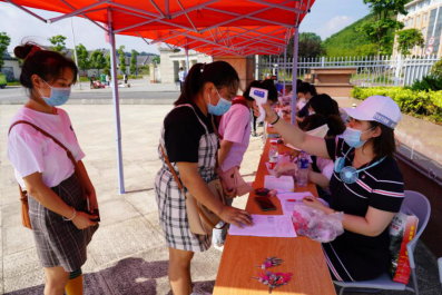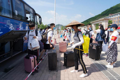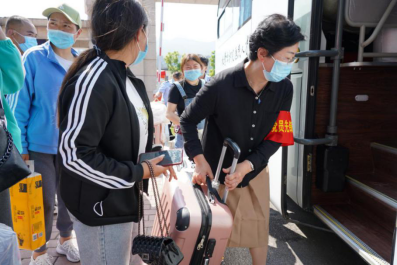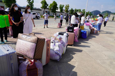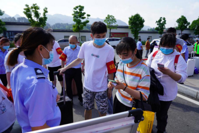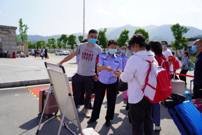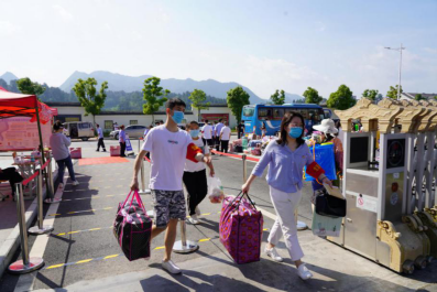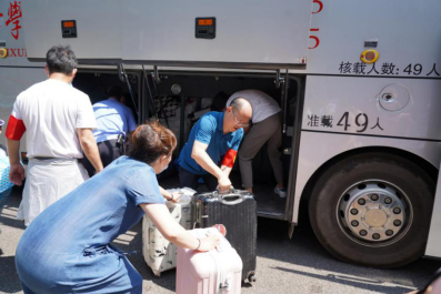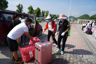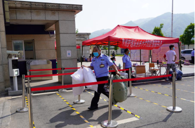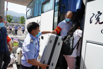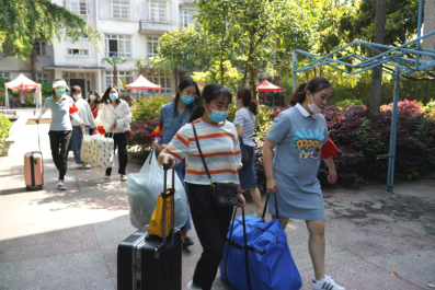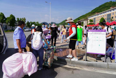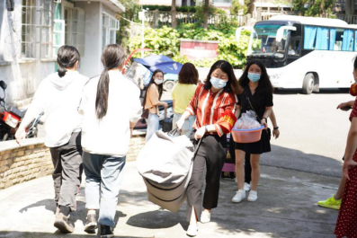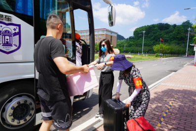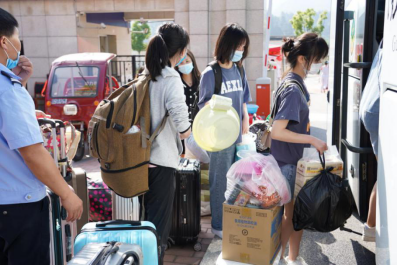 校门口,同学们陆续到达,保卫处的叔叔阿姨们帮大家一个个卸下行李,保洁阿姨早已做好消杀行李的准备。