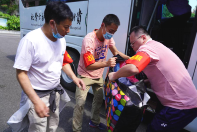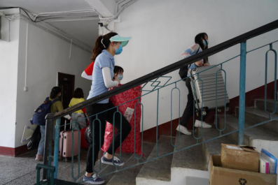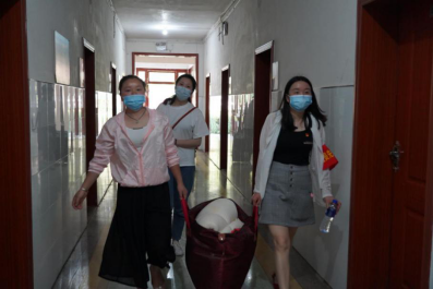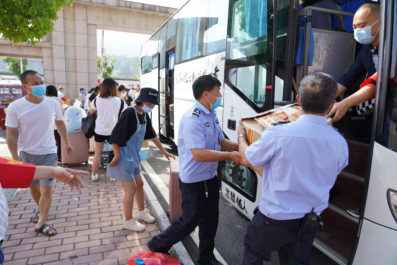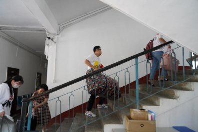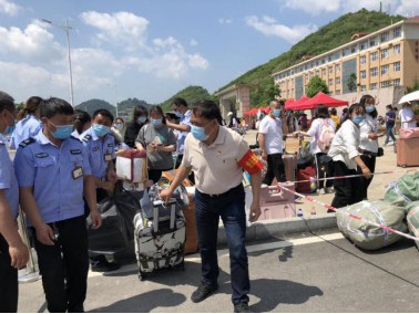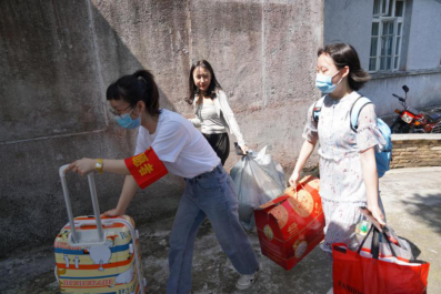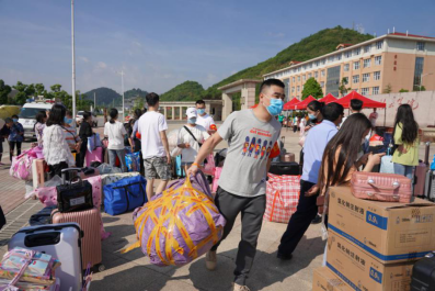 返校当天,学院当地气温高达34℃,志愿教师们和保卫等工作人员,顶着炎炎烈日,一件一件地帮助同学们将行李装车、卸车并搬运至寝室所在楼层。他们的双颊晒得通红,脸上和身上汗如雨下,却从未停下来来往往搬运行李的脚步……