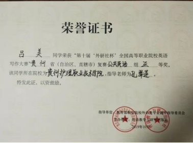 金秋十月是收获的季节!2019年10月20日,第十届“外研社杯”全国高职高专英语写作大赛贵州赛区复赛在贵阳职业技术学院隆重举行。伟德2018级高职1班盛亚同学与2018级高职15班吕美同学均荣获公共英语组三等奖,英语教研室黄静汝老师、孔翠莲老师获优秀指导教师奖。