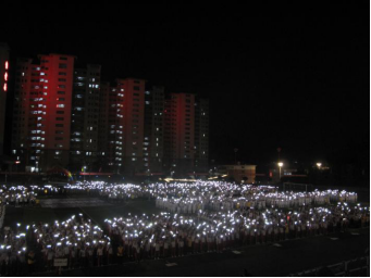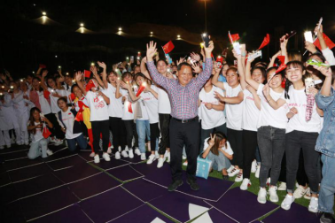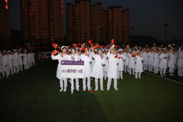 “五星红旗迎风飘扬,胜利歌声多么响亮;歌唱我们亲爱的祖国,从今走向繁荣富强......”在慷慨激昂的合唱《歌唱祖国》中,师生全体起立,群情激荡。大家手中挥动的灯光晶莹透亮,如星星之火,激情洋溢,充满火热的希望,令人振奋动容。