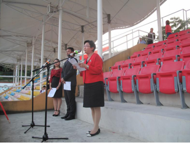 喝彩声不绝于耳,主持人的精彩串词,同学们雄壮的歌声在体育场上空久久回荡。学院党委书记黄亚励热情洋溢的致辞后,红歌会正式开始。