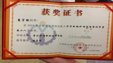 夏雨歌同学是伟德中职护理专业2017级学生,在今年4月举办的2019年贵州省职业院校护理技能大赛暨全国职业院校护理技能大赛选拔赛中,她以扎实、娴熟的护理理论知识和实操技术获得中职组一等奖的好成绩,并由此获得代表贵州省参加2019年全国职业院校技能大赛中职组护理技能赛项比赛的机会。在随后的两个月中,伟德指导教师张莉莉、朱虹帮助备战选手充分吸取贵州省技能大赛中的经验,对照评审专家提出的不足和改进意见,有针对性地从理论知识、操作技术、心理素质等方面着手,进行了系统、深入、细致的训练,为伟德选手在本次全国技能大赛中获奖奠定了扎实的基础。