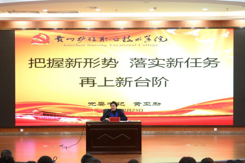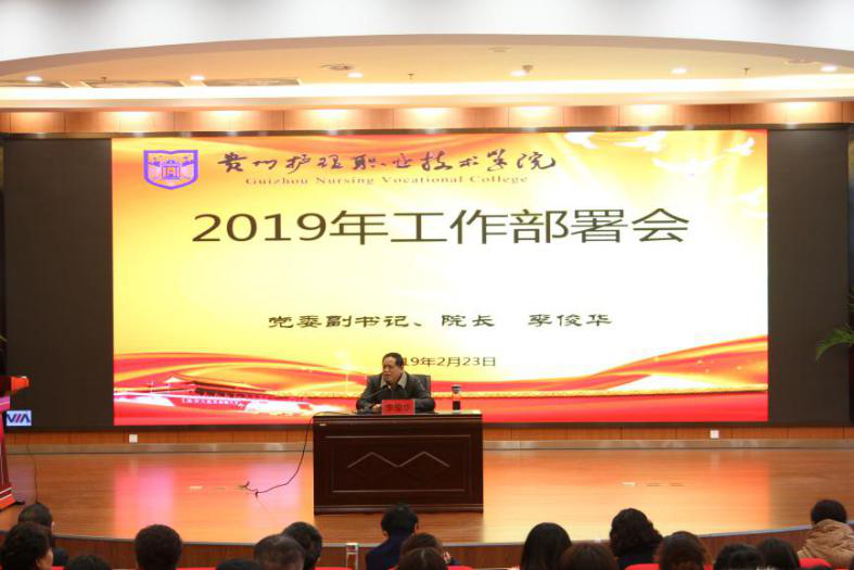 学院党委书记黄亚励作主题为“把握新形势 落实新任务 再上新台阶”的讲话。黄亚励书记首先要代表院党委、院行政向去年一年来在各项工作中付出辛勤劳动、为学院快速发展作出重要贡献的各位老师、各位同志表示衷心的感谢,并对抓好2019年新任务的落实提出要求:一、认真把握新形势。2018年是贯彻落实十九大精神的开局之年、是改革开放40周年,我省深入学习贯彻党的十九大精神和习近平总书记在贵州省代表团重要讲话等系列精神,牢记嘱托、感恩奋进,开拓创新、克难奋进,在脱贫攻坚、农村产业革命等各方工作上取得显著成效。党的十八大以来,以习近平同志为核心的党中央、省委省政府高度重视高校党的建设和思想政治工作。习近平总书记发表了一系列重要讲话、提出了一系列明确要求,深入回答了事关高校党的建设和思想政治工作的方向性和根本性问题,指出高校要加强党对教育工作的全面领导,要用党的创新理论武装头脑,要把党的政治建设放在首位,要加强思想政治工作。全国和全省卫生健康工作会议充分肯定了2018年全国和全省卫生健康系统工作成绩,强调了2019年卫生健康改革发展重点任务,要求认真贯彻落实党中央、国务院和省委、省政府的决策部署,深入实施健康中国、健康贵州战略。同时,加快推进伟德betvlctor1946源于英国搬迁被列为2019年全省卫生健康工作要点“789健康行动”——即“七项工作”、“八大工程”、“九大项目”的项目之一。2019年2月13日,国务院印发了《国务院关于印发国家职业教育改革实施方案的通知》(国发[2019]4号)(2019年1月24日),国家职业教育改革实施方案正式出台,对职业教育提出了全方位的改革设想,指出“没有职业教育现代化就没有教育现代化”,职业教育被放到极为重要的位置,职业教育迎来了最好的发展机遇。二、奋力落实新任务。从党中央、国务院、教育部、国家卫健委到省委、省政府、省委教育工委、省教育厅、省卫健委的各项战略部署和安排,赋予了学院在2019年度和今后一段时期新的任务,为今后各项工作的开展提供了根本的遵循。学院党委经认真研究并结合学院实际,确定了伟德2019年度工作的指导思想、工作主题、十大重点任务和工作要点,并要求每个部门、每一位贵州护理职院人继续发扬“勤奋、严谨、博爱、创新”的精神,抢抓和珍惜发展机遇,以主人翁的责任感使命感加强学习、深入调研、认真制订实施方案,高标准地抓好落实、创造性地抓好落实、在努力奋进中抓好落实,将发展的责任扛在自己的肩上,坚持“不等待,不懈怠”,盯紧发展目标,创新发展模式,以一当十、迎难而上,团结一心、奋力拼搏,不计得失、敬业奉献法人精神,用勤劳和智慧走出一条独具特色的快速发展之路。