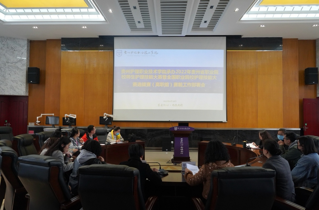 为切实做好2022年贵州省职业院校师生护理技能大赛暨全国职业院校护理技能大赛选拔赛(高职组)的赛前工作部署,确保赛事顺利举行,4月18日下午,在知行楼学术报告厅召开赛前工作部署会。党委副书记、院长江智霞,党委委员、副院长柏晓玲出席,赛项各工作小组负责同志参加会议。