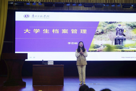 李忠峪围绕大学生档案的主要内容和毕业生档案管理的流程,以贵阳市人才服务中心接收和管理大学生档案等为例,对大学生档案管理的相关知识进行了系统阐释和深入解读,通过自身多年从事档案工作的经历和具体案例给在场的教职工生上了一堂深入浅出、内容生动的档案课,同时教导大学生要重视个人档案的管理,希望同学们遵守国家法律和学院管理规定,珍视个人档案信用记录,努力学习为今后的成长成才打下坚实的基础。