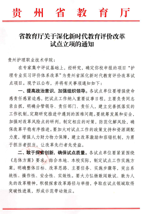 2022年3月14日,贵州省教育厅印发《贵州省教育厅关于申报深化新时代教育评价改革试点项目的通知》。按照通知精神,学院领导高度重视,深入研究,结合学校发展实际,教学质量监控与评估办公室牵头组织教务处、公共基础部、护理系积极申报试点,经过学院有关专家审核后报送了《护理专业实习评价体系改革》《深化急危重症护理学实训考核改革》2个试点项目。