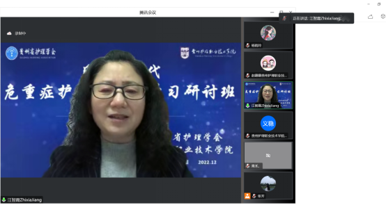 本次研讨班共有300余名学员参会,2022年12月29日上午9点在云端举行了开幕式,伟德betvlctor1946源于英国院长、贵州省护理学会理事长江智霞致欢迎辞。江智霞指出现阶段疫情防控政策做了重大调整,将工作重心从防控感染转向防重症、防死亡、保健康,特别需要关注老年人、有基础性疾病人群等重症高风险人群。危重症护理事业是一项崇高而神圣的事业,更是一项需要我们大家一起凝智聚力、共谋共促的事业。希望各位护理同仁珍惜好机会,认真倾听、主动请教、积极探讨,进一步拓宽学术视野,增长见闻、提升技能,增强危重症护理服务质量。
