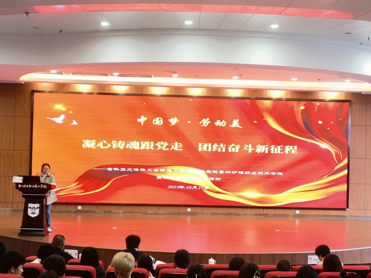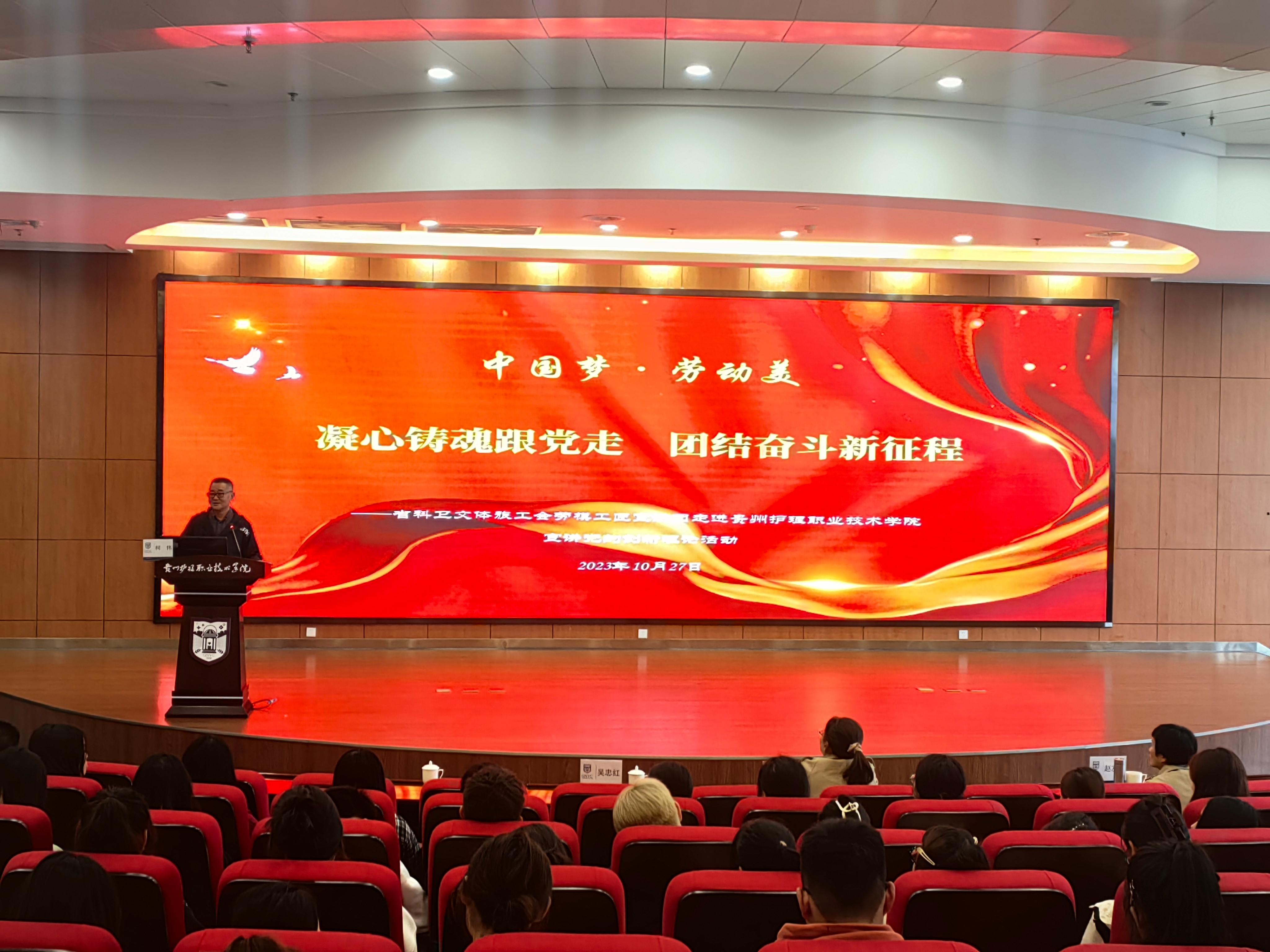 10月27日,伟德工会委员会与贵州省科卫文体旅工会在伟德金海校区联合开展劳模工匠宣讲“中国梦·劳动美――凝心铸魂跟党走团结奋斗新征程”主题宣传教育活动,出席活动的有省科卫文体旅工会副主席孙艳,省科卫文体旅工会二级主任科员赵友琼,伟德党委副书记、工会主席吴忠红,省科卫文体旅工会劳模工匠宣讲团成员柯伟,师生代表200余人。