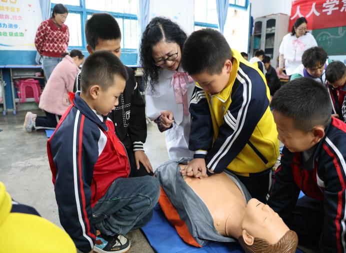在龙场小学,为进一步加强乡村健康科普教育和健康促进工作,有效将急救知识、安全知识和健康知识推广覆盖到更多群体,营造“人人学急救,急救为人人”的良好社会氛围,助力乡村振兴,学院教师及学生代表走进教室。他们运用通俗易懂的语言,结合常见的案例,为龙场小学学生详细讲解了“海姆立克急救法”和“心肺复苏术”产生背景、使用场景、操作方法及注意事项等,并邀请小学生们进行现场模拟操作,手把手进行指导,激发了小学生们浓厚的学习兴趣。