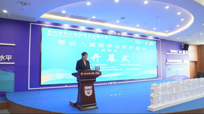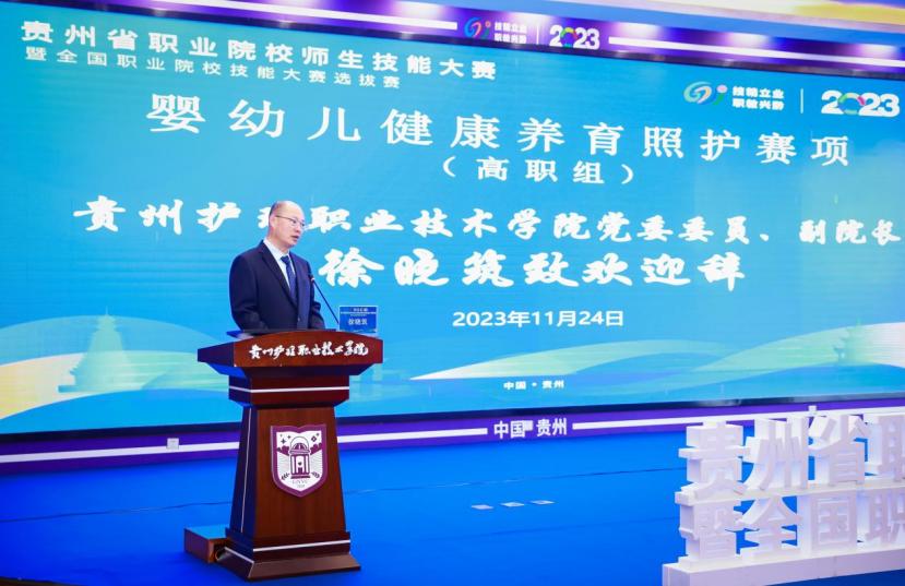 徐晓筑为开幕式致欢迎辞,他首先代表学院党委、行政以及全体教职工生向出席和参加本次开幕式的领导、专家评委、参赛选手表示最热烈的欢迎。他表示,婴幼儿照护服务是生命全周期服务管理的重要内容。近年来,党中央、国务院,省委、省政府将“幼有所育”摆在了更加突出的位置,先后出台《3岁以下婴幼儿健康养育照护指南(试行)》等重要文件,为婴幼儿照护服务行业高质量发展夯实了基础、积蓄了动能、激发了活力。今年,婴幼儿健康养育照护赛项在我省是首次举办,学院党委、行政高度重视,统筹推进,高质量完成了大赛筹办各项工作。此次技能大赛的举办,是贯彻落实党的二十大精神的具体举措,也是扎实推进“技能贵州”“健康贵州”建设的重要实践,我们将以办好此次大赛为契机,激发创新之志,永葆工匠之心,以仁心护生命,以匠术卫健康,努力做好人民健康的守门人,为职业教育和卫生健康事业高质量发展实现新跨越贡献力量。