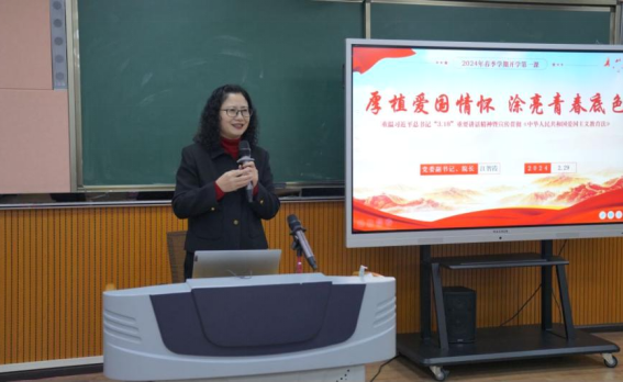 今年是中华人民共和国成立第75周年,是习近平总书记发表“3·18”重要讲话精神的第五周年。为加强大学生思想政治教育,引导学院广大青年学子树立正确的价值观,传承和弘扬爱国主义精神,2月29日,学院党委副书记、院长江智霞走上讲台,以“厚植爱国情怀 涂亮青春底色”为题,采用线上、线下相结合的方式,为金海校区全体学生讲授了一堂生动的爱国主义“开学第一课”。