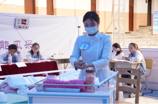 赛中,各位选手动作熟练、流程规范,完成了一系列与育婴相关的实际操作。同时,通过温柔的语言、亲切的笑容和适当的肢体动作,模拟与婴幼儿建立起良好的情感联系的过程,展现出了出色的专业技能和深厚的育婴知识。