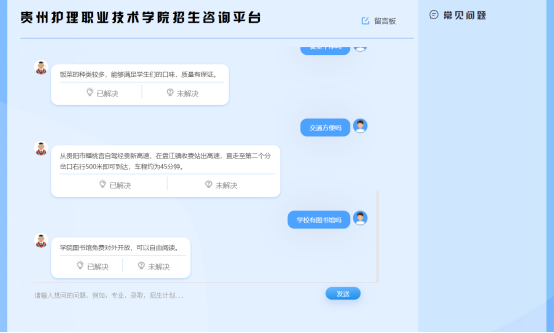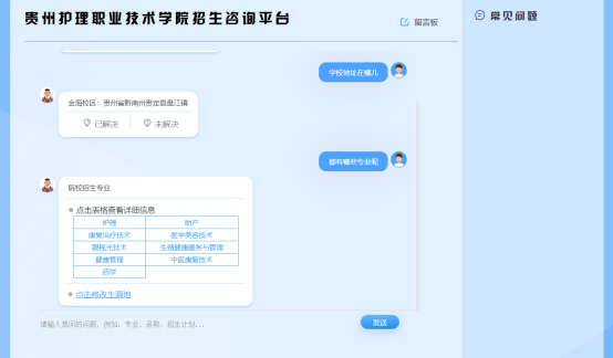 在我院微信公众号查询窗口中,选择“招生咨询”跳转至“招生咨询智能问答系统”,完善基础信息后,即可进入问答页面,进行文字或语音提问,同时可在问答页面点击查询报考常见问题,对于未解答的问题,可点击留言咨询以便老师及时回复。
