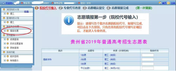 2.考生按照本人事先填写好的《贵州省2019年高考志愿纸质样表》,输入院校代号并认真核对院校名称是否正确。(图-8)