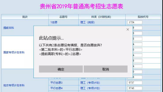 4.若志愿表没有填写完整,系统将提示漏填的批次和志愿,点击“取消”返回重新填写院校代号,点击确定将放弃没有填报的志愿。(图-10)