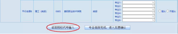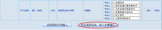10.院校和专业填写确定无误后,请点击下图中“专业选择完成”按钮(图-16),进入志愿确认页面。