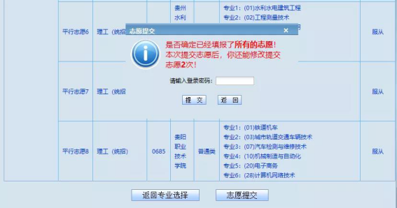 12.所填志愿经确认无误后,请点击页面下方的“志愿提交”按钮(图-18)。在志愿提交确认对话框中再次输入登录密码,完成志愿提交(图-19)(若同时填报体育、艺术类本科院校和提前批本科院校无法提交。)。