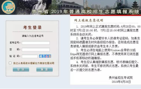 考生填报志愿应使用IE浏览器,输入网址http://gkzy.eaagz.org.cn,打开高考网上填报志愿系统首页,仔细阅读《网上填报志愿说明》后,点击“我已认真阅读并理解右方填报志愿说明”方框,输入准考证号、密码,在验证码输入框内输入右边显示的4位彩色数字,点击“登录”按钮进入志愿填报页面。