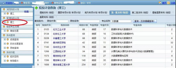 考生点击“查询院校计划”列表下的科类名称,进入院校计划查询页面。考生可以输入院校代号、或者院校名称和专业名称查找要报考的院校和专业。系统支持模糊查询,例如在专业名称中输入“大数据”,可显示所有专业名称中含“大数据”的院校信息。(图-5)