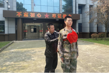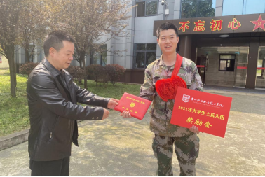 学院领导为新兵陈怀江同学颁发毕业证书和入伍奖励