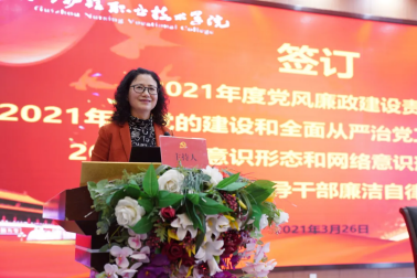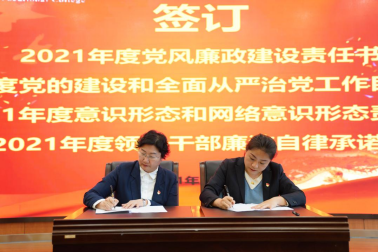 会上,党委书记黄亚励同志与学院领导班子成员签订了2021年全面从严治党工作责任书,与各党支部书记签订了2021年度党的建设暨全面从严治党工作目标责任书,与各部门负责人签订了2021年意识形态和网络意识形态工作责任书。会上还签订了领导干部廉洁自律承诺书。