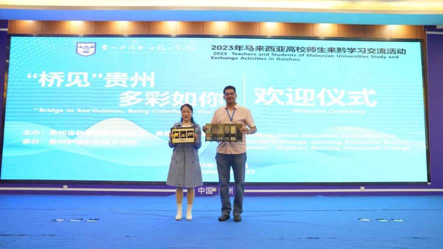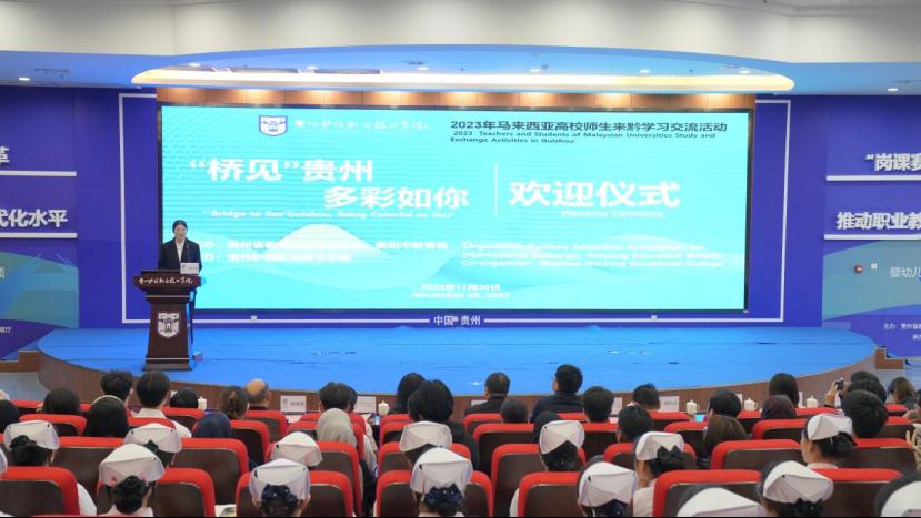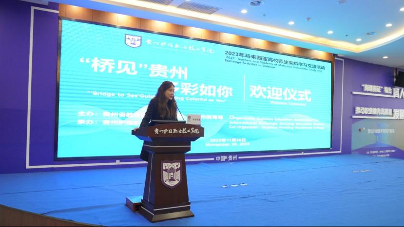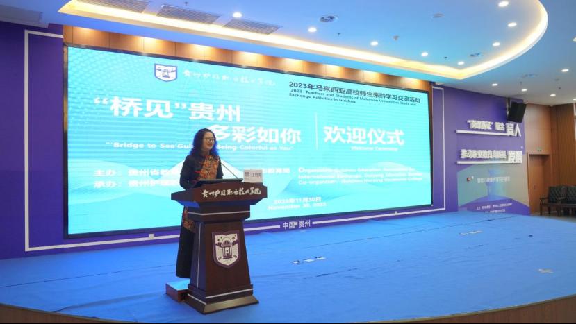 2023年11月30日,贵州省教育国际交流协会联合马来西亚多所大学以“‘桥见’贵州·多彩如你”为主题,在伟德开展国际师生来黔交流活动。欢迎仪式在伟德学术交流中心举行,出席欢迎仪式的有马来西亚马中友好协会副秘书长黄振隆、马来西亚教育部特别官员Khairul Anuar Bin Abdul Manap、吉隆坡青年理事会主席 Mohamed Naseer Bin Mohamed、领队教师以及29名马来西亚留学生,伟德党委副书记、院长江智霞,党委副书记吴忠红,党委委员、副院长徐晓筑,党委委员、纪委书记杨伯兵,党委委员、副院长柏晓玲以及相关部门负责人、学生代表出席了欢迎仪式。欢迎仪式由学院办公室副主任代世嗣主持。