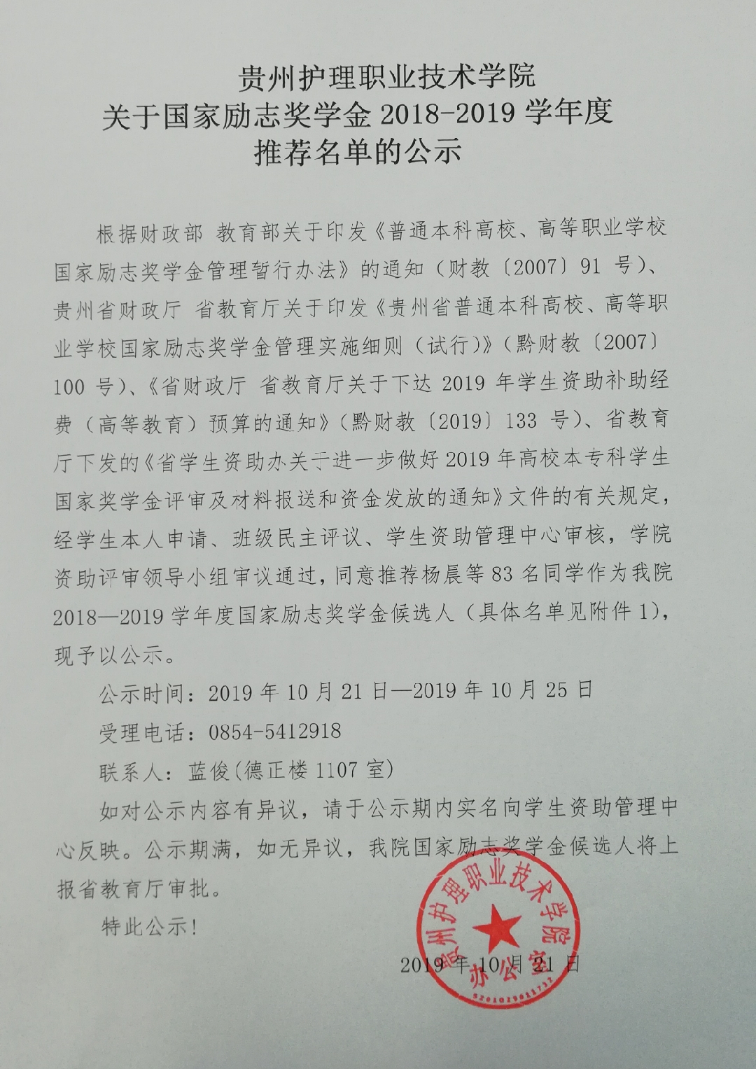 关于追加国家奖学金2018-2019年度推荐名单公示