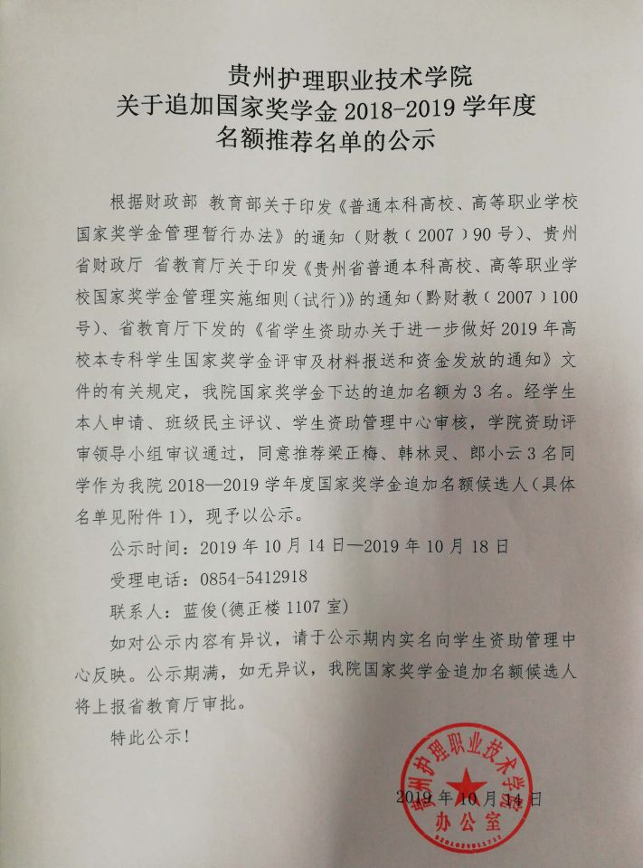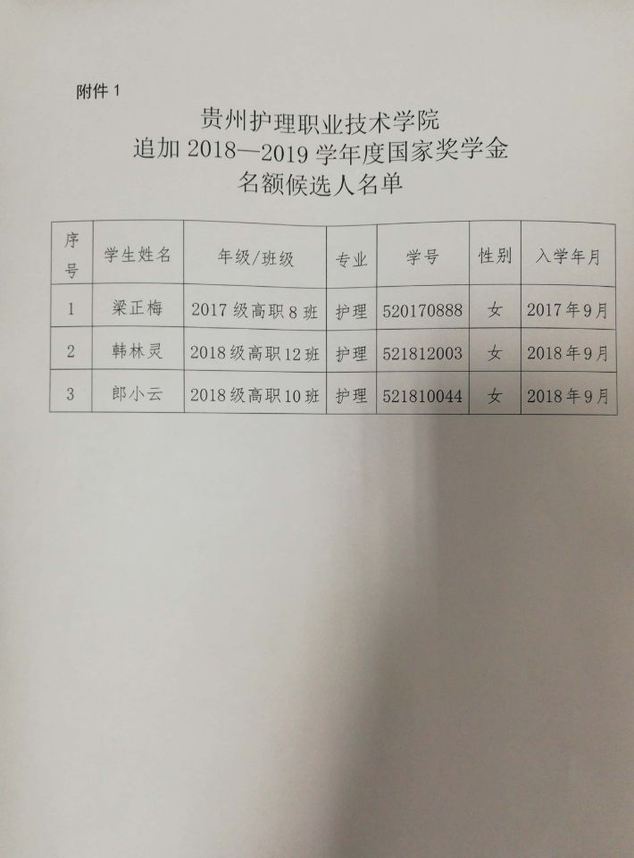 关于追加国家奖学金2018-2019学年度名额推荐名单的公示