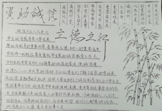 在今年的诚信教育主题活动中,学院通过调查问卷、主题班会、绘画活动等形式,对广大高职学生广泛宣传了国家助学贷款政策及诚信、金融知识的普及和宣传。
