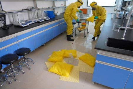 江智霞宣布演练正式开始,洪阳指挥应急救援人员按照实验室危化品泄露后的有序撤离、初步处置、现场封锁、等级评估、有序上报、应急救护、危险消除、现场恢复、调查评估、结果汇报的顺序开展。