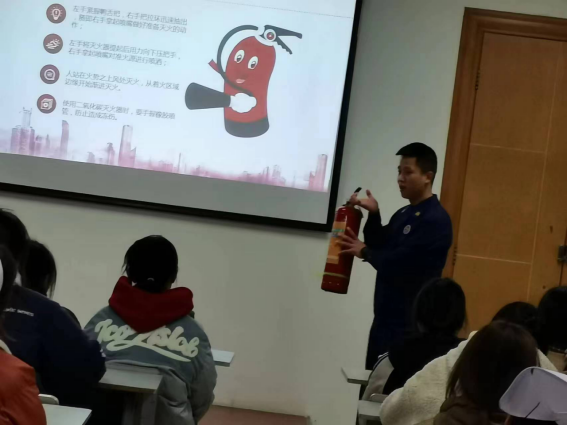 此次讲座以线上线下相结合的方式进行,刘站长分别从消防的法律法规、火灾的基本概念、灭火器和消火栓的使用方法以及组织疏散逃生的能力等方面进行讲述,并现场演示了灭火器和消火栓水带的使用方法。