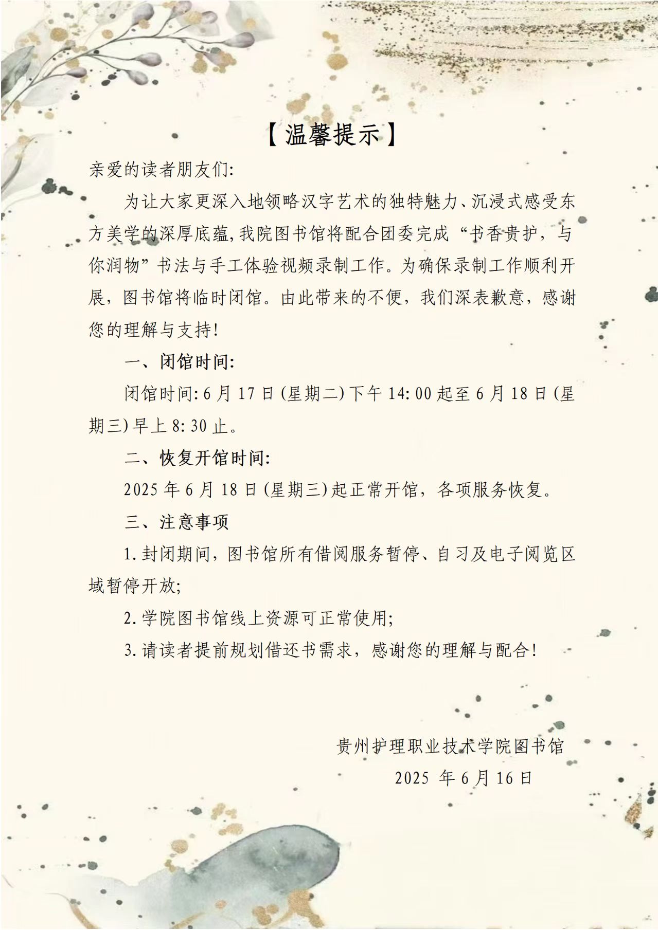 【温馨提示】伟德图书馆将配合团委完成“书香贵护,与你润物”书法与手工体验视频录制工作,为确保录制工作顺利,图书馆将临时闭伟德图书馆将配合团委完成“书香贵护,与你润物”书法与手工体验视频录制工作,为确保录制工作顺利,图书馆将临时闭馆